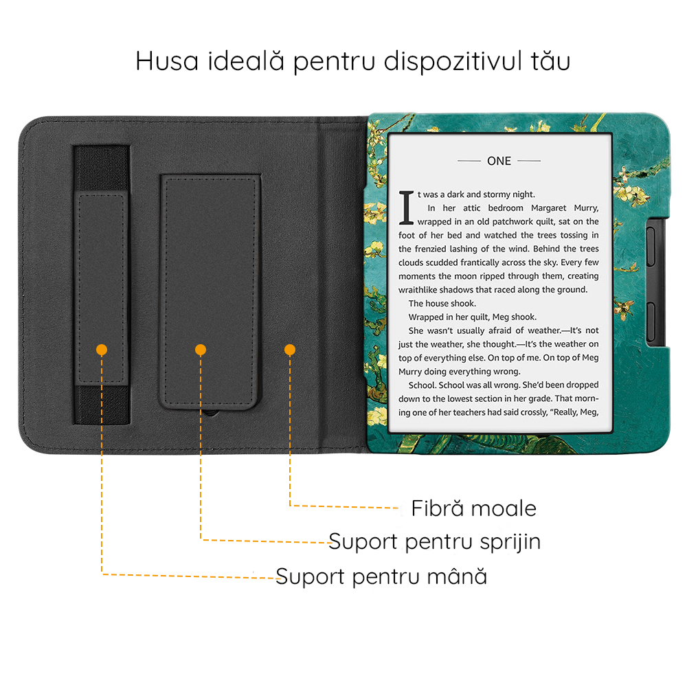 - Datorita suportului pentru birou atasat husei Kindle Paperwhite nu mai este necesar sa tii e-book-ul in mana, atunci cand citesti.